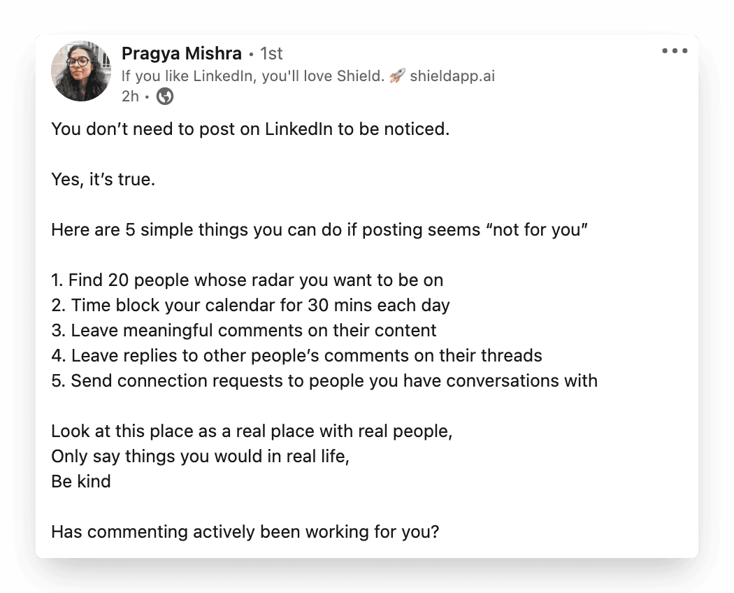 A great way to approach this is by time-blocking your calendar specifically for LinkedIn like Pragya does.