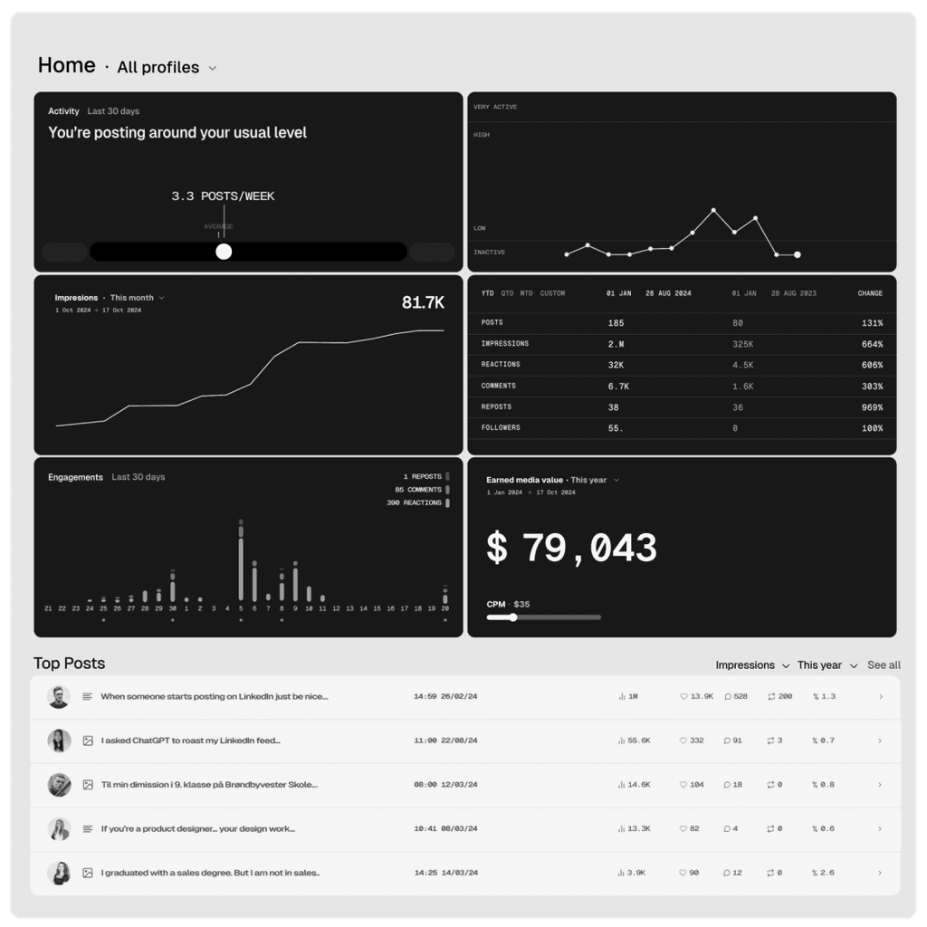Get accurate data and detailed insights into your team’s LinkedIn performance. From post engagement to follower growth, our dashboard provides a clear view of what’s working and where improvements can be made.