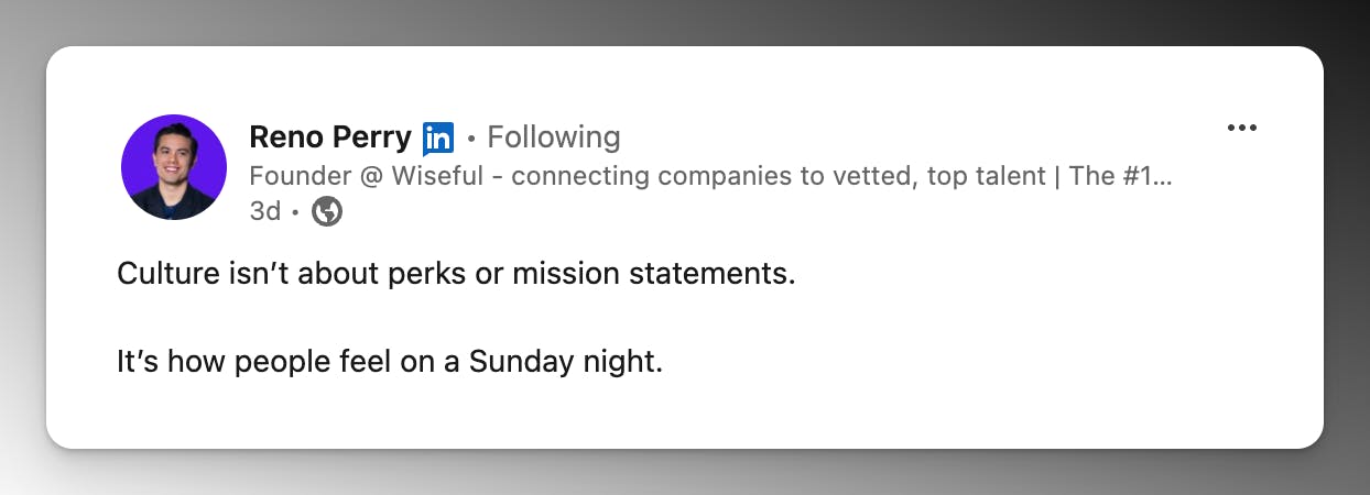 Reno Perry redefines company culture beyond perks and mission statements, focusing on how people feel