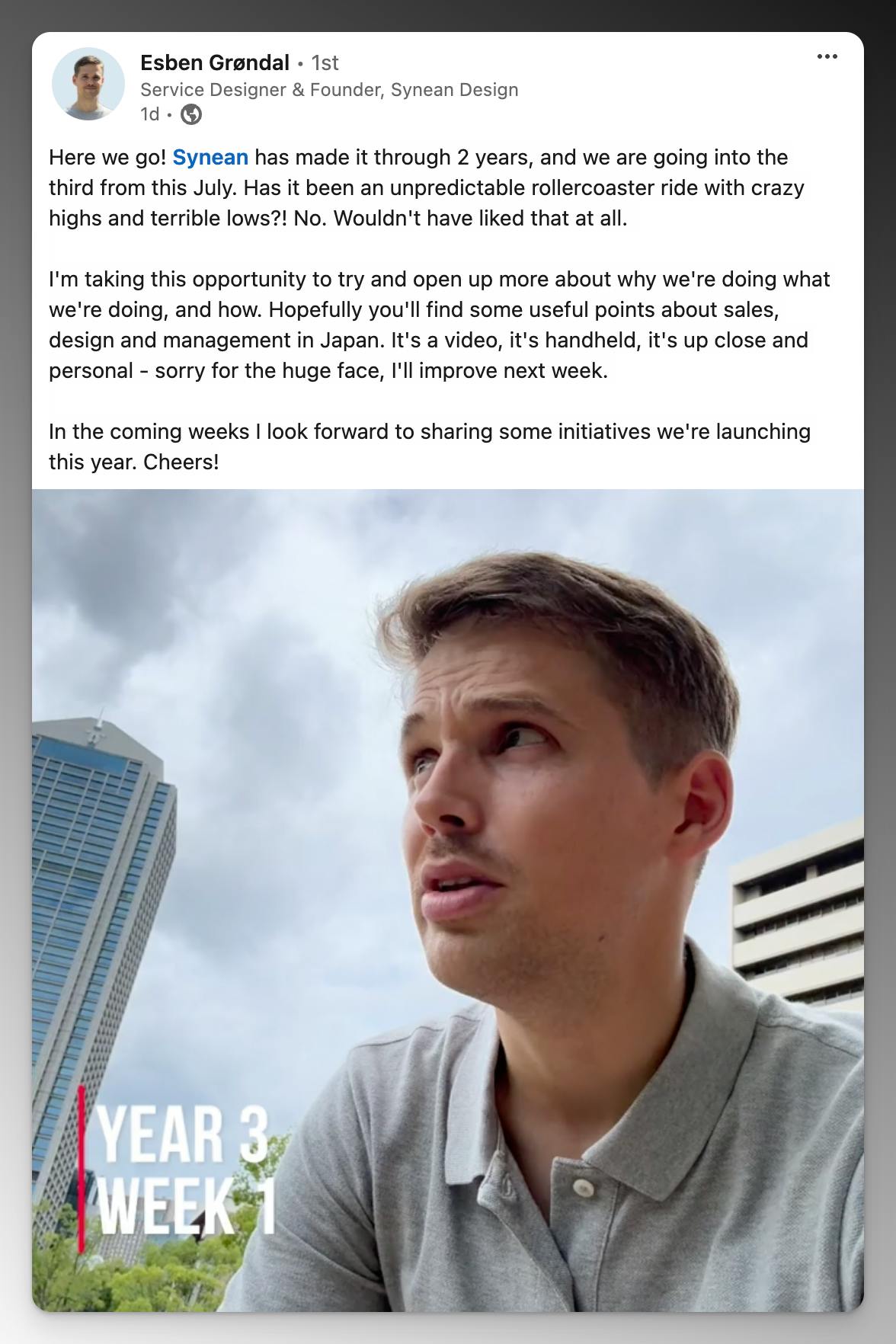 Esben Grøndal celebrates Synean's two-year milestone with a candid video discussing sales, design, and culture