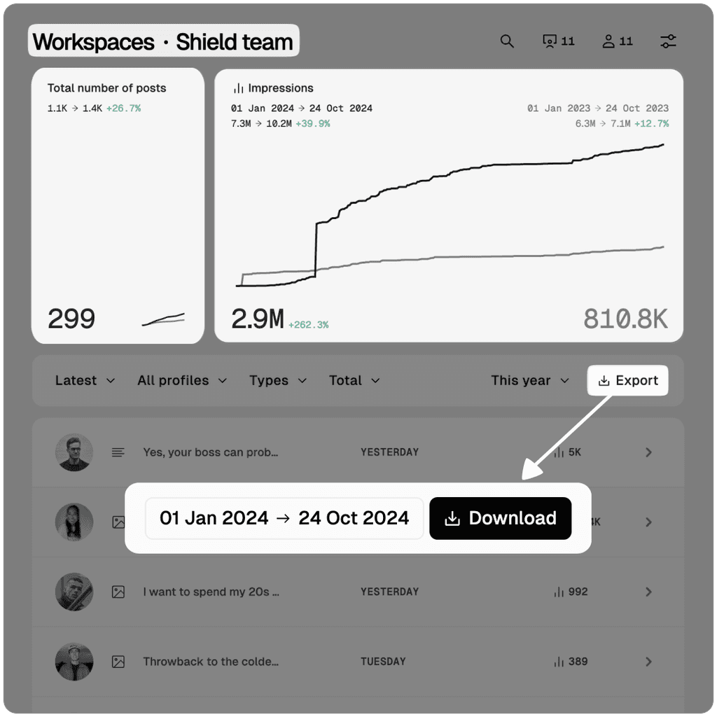 Calibrate your approach by understanding your audience and how they engage with your content. From follower growth to profile views, post engagement and audience demographics, Shield helps you stay on top of the metrics that matter most.