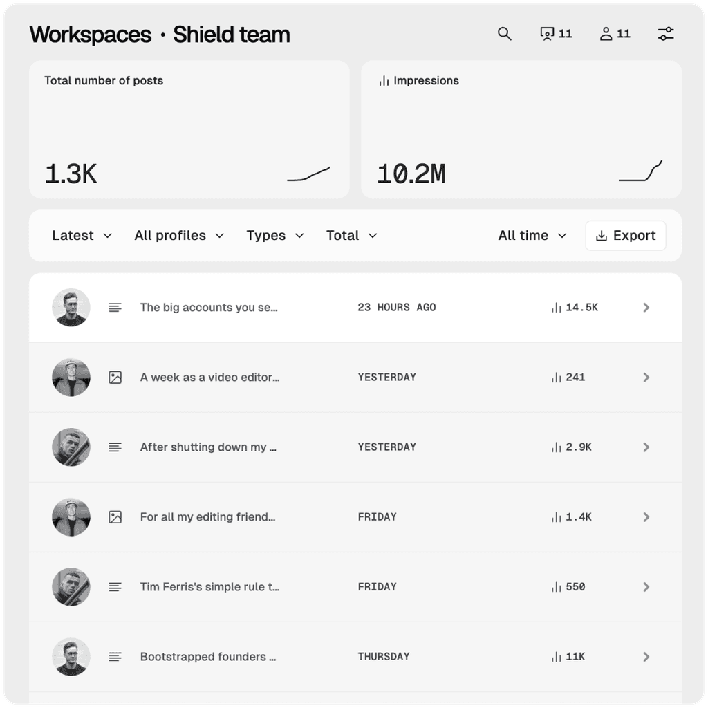 Whether you're managing a single LinkedIn profile, a large team, or run an employee advocacy program, Shield makes it easy to track and measure performance across any number of personal LinkedIn profiles.