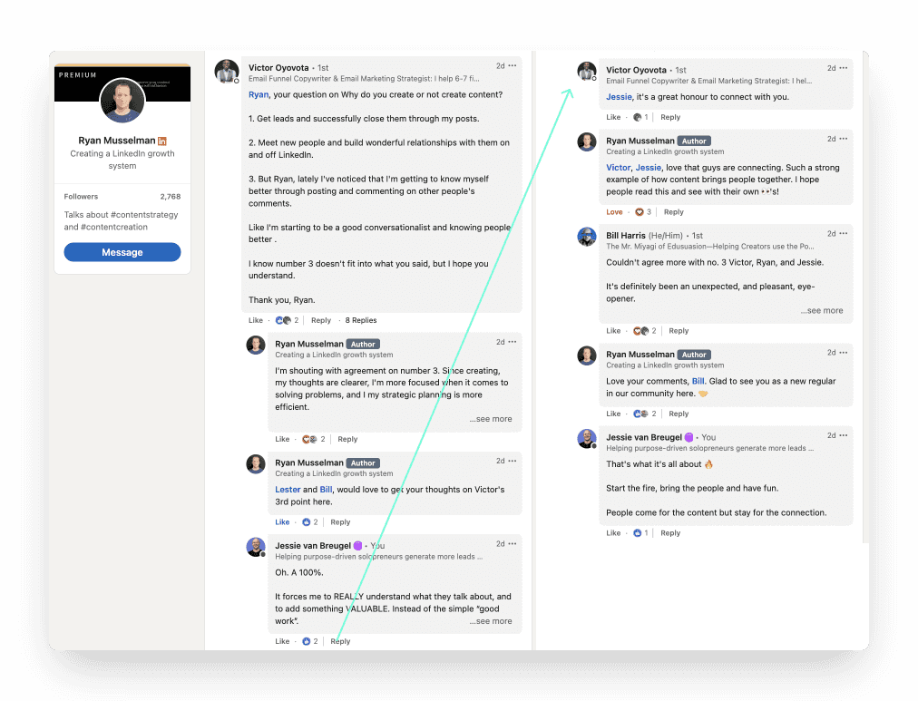 An example of how the first comment of Victor Oyovota resulted in a conversation between 4 different creators: