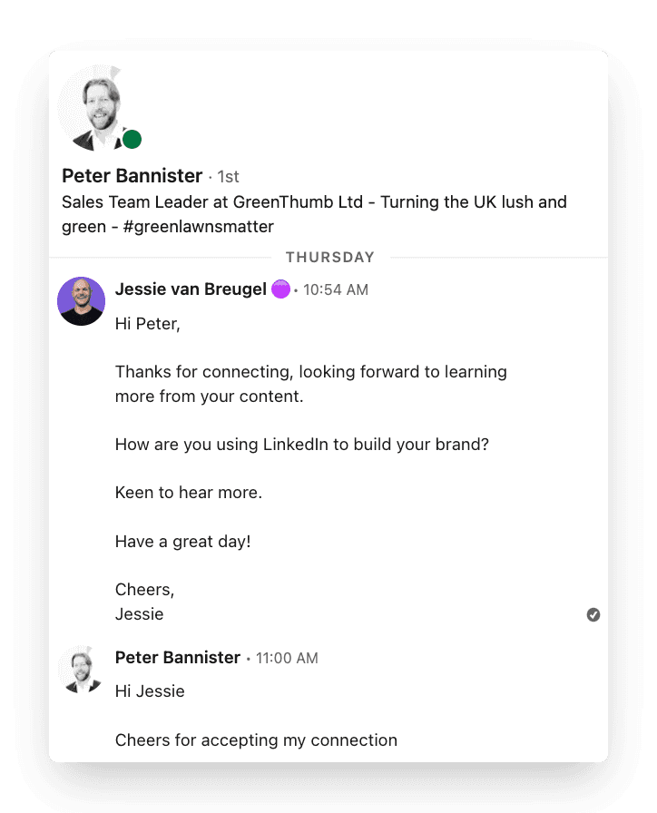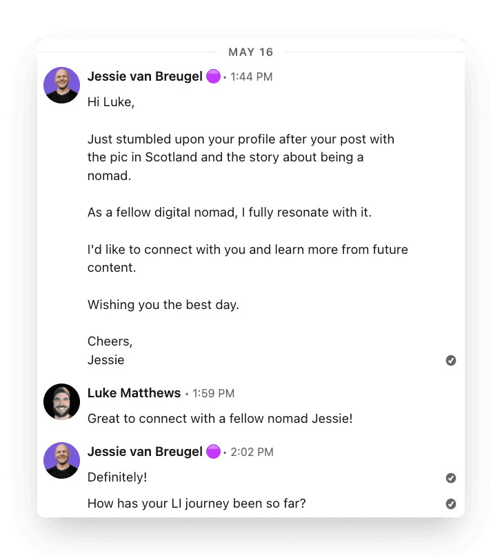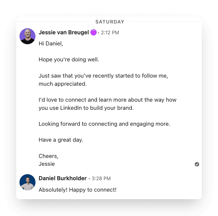 Send that person a personalized connection request and open the conversation. This way, you build engaged and real relationships, one step at a time.