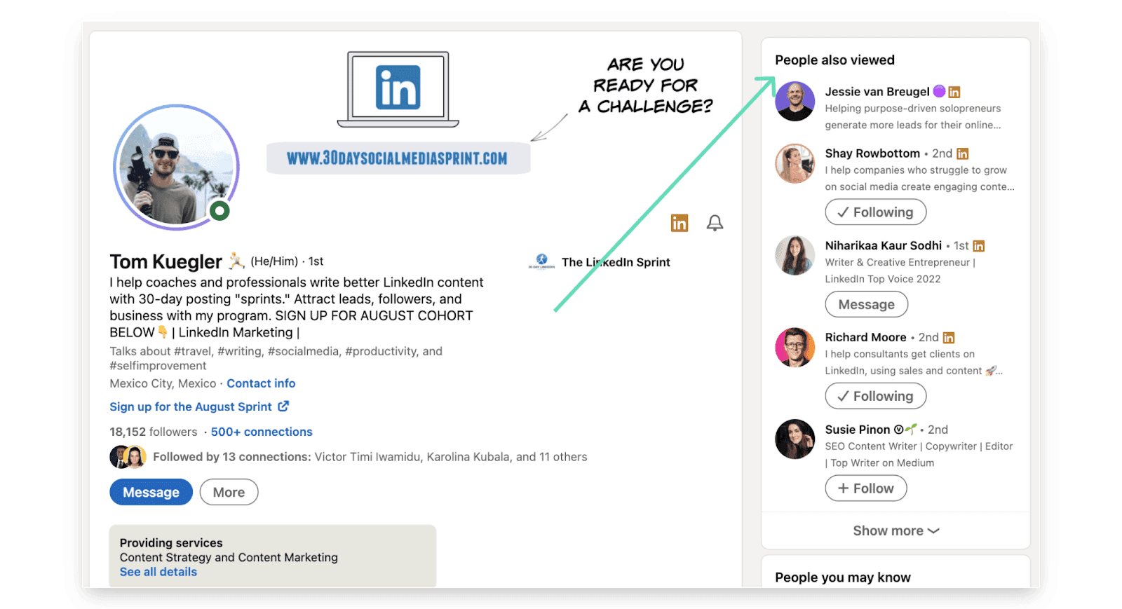 Once you find interesting people to follow and connect with, you can follow the breadcrumbs by browsing through the suggestions on LinkedIn, under the tab “People also viewed”.