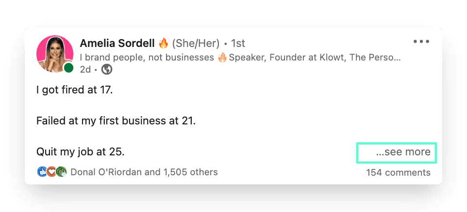 Let's look at Amelia Sordell’s post below. She starts her post with great storytelling with a strong hook and builds up in lines 2 and 3 so the reader cannot resist but click the see more to continue the story.