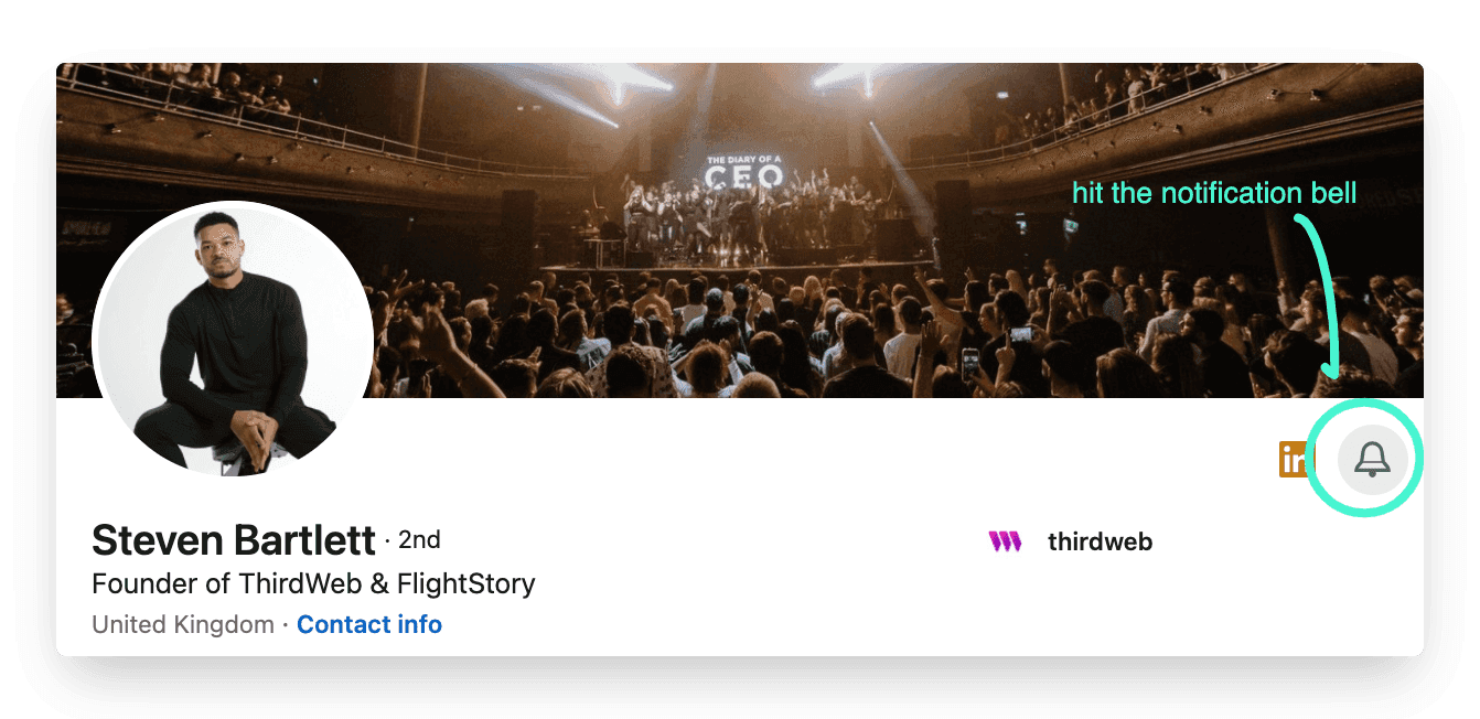 Navigate to their profile and turn on notifications. This will notify you when they post new content and ensure you don’t miss anything valuable. Just hit the notification bell as featured here ↓