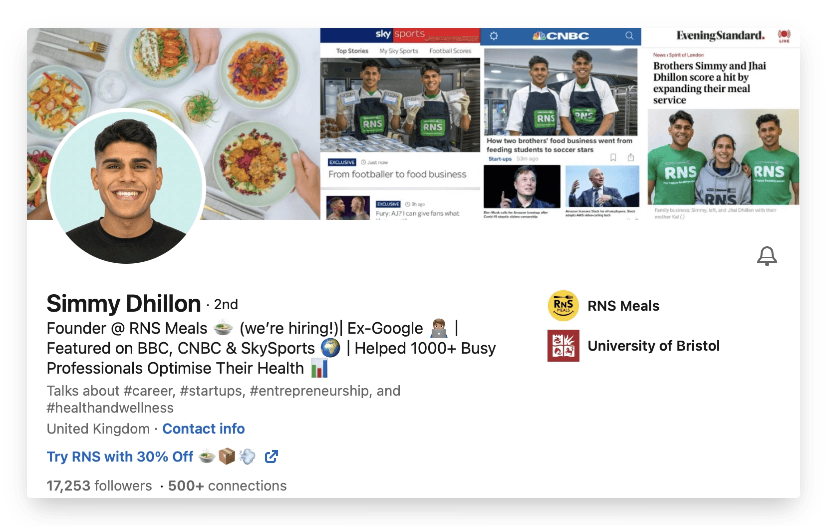 His header image showcases what his company RNS Meals does as well as some of their accolades. If your company has distinctive brand colours, you could factor them into your header too.