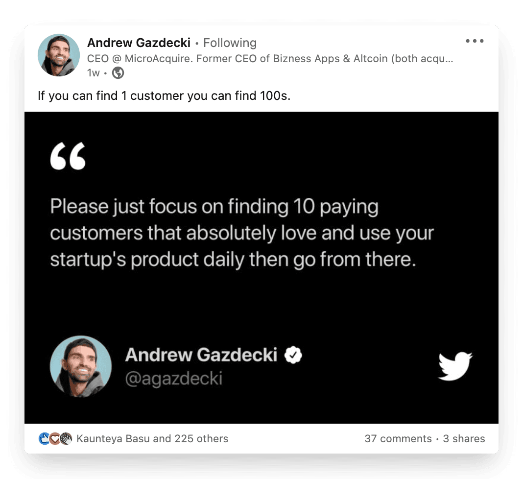 To paraphrase Andrew Gazdecki’s post and relate it to audience building: Find your 10 loyal followers, know what works for them and why, and you are all set for growth.