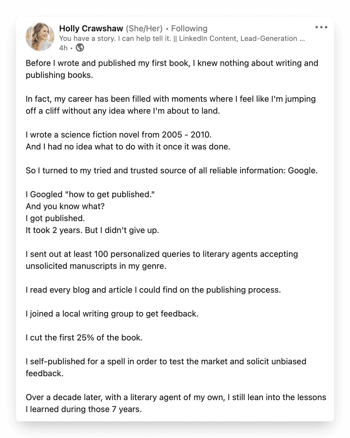 Holly’s in the unique position of having published her first book. As such, she’s got plenty of knowledge and experiences that she can leverage in her content.