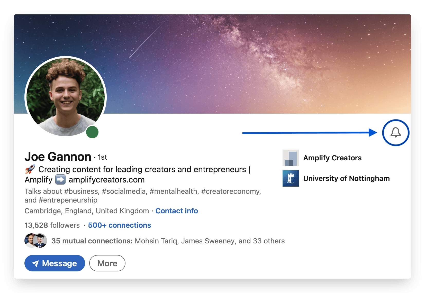 To make this process even more streamlined, you can turn notifications on for different LinkedIn creators, so that you’re notified whenever they post! Just click the bell icon at the top of the profile page.