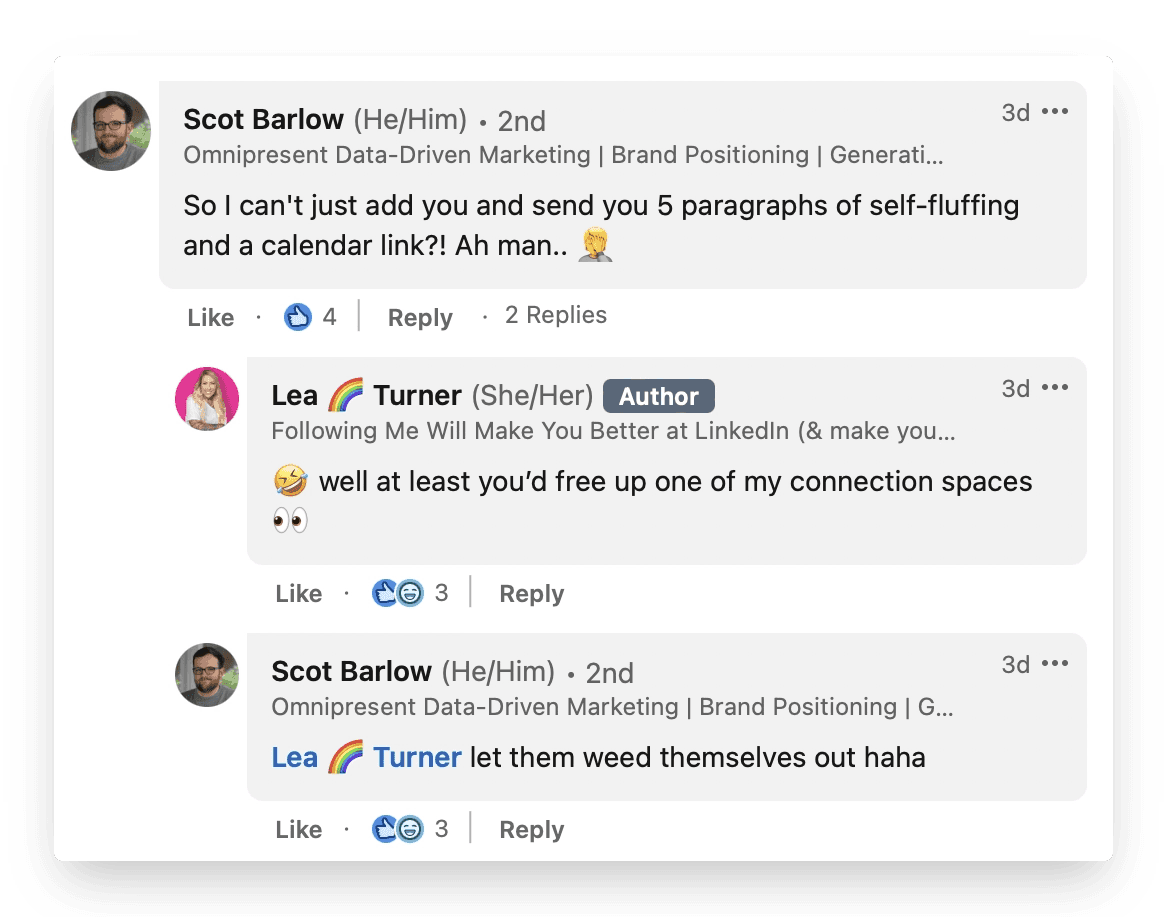 Lea responds to Scot’s comment because, you guessed it, he actively engages with the topic at hand, adding his own opinions about the post’s core message.