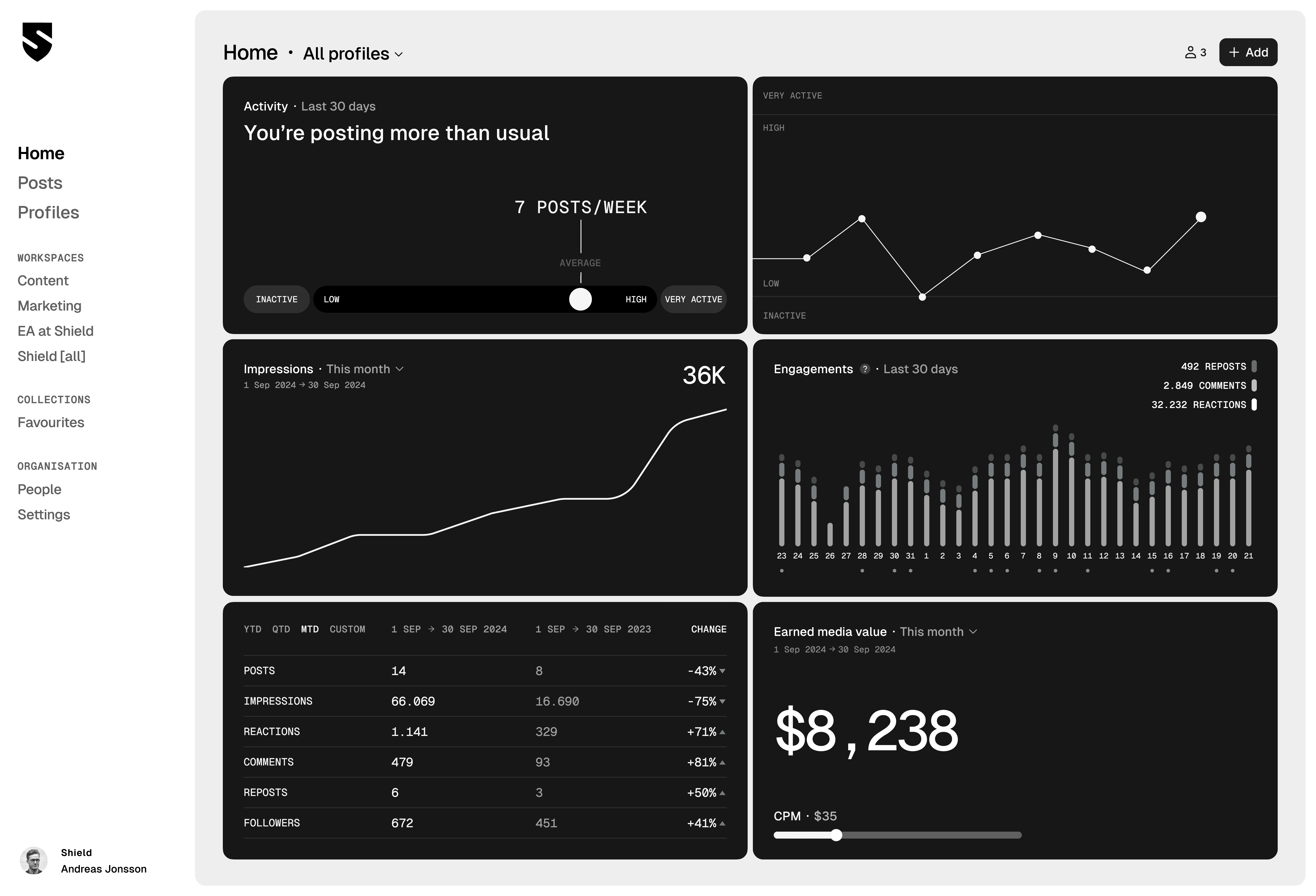 With Shield, you can organize all your advocates in one workspace, easily track their LinkedIn activity, and gather insights on their engagement metrics.