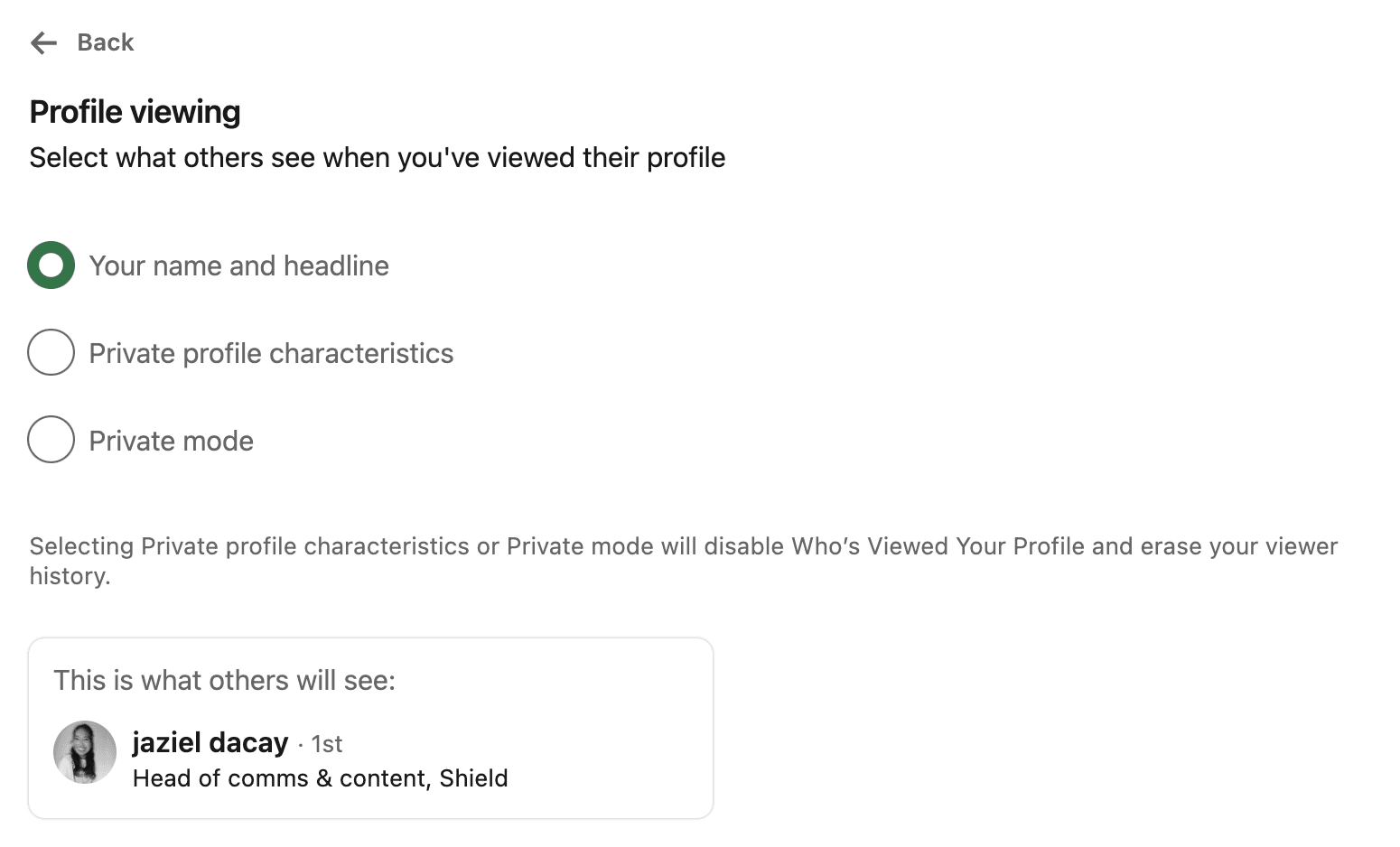 In order to change these settings, you click on your profile picture in the top right corner and head to “Settings and privacy”. Then, in the menu on the left side, you choose “Visibility” and in the first option of that menu “Profile viewing options”, you adjust the following settings.