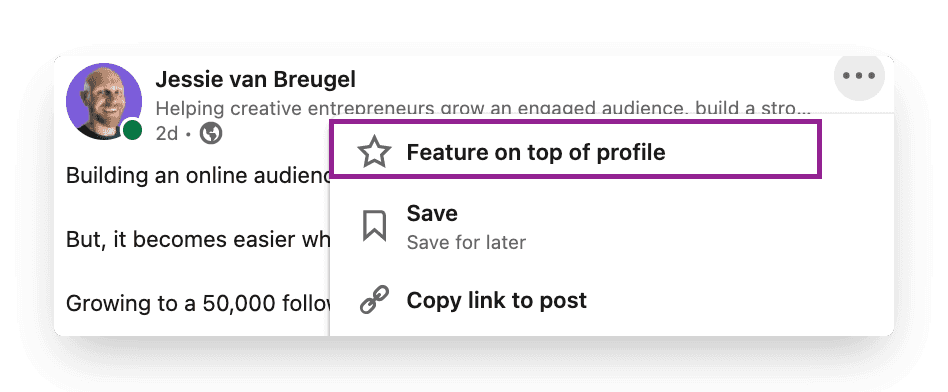 Sharing case studies, white papers and other brand content helps you to show what the brand you build is all about. Besides, it helps people understand your passion and commitment to a certain field as well. To feature a piece of content on your personal profile, you head over to the specific post and click the three dots on the right side. Then, you choose the first option to pin it to your profile.