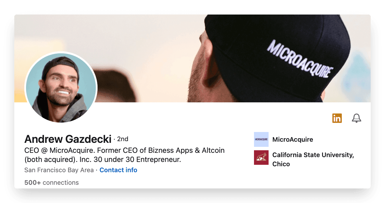Another great example is the CEO of MicroAcquire, Andrew's header. He creatively uses a picture of him with his brand visible. Cool usage of the header!