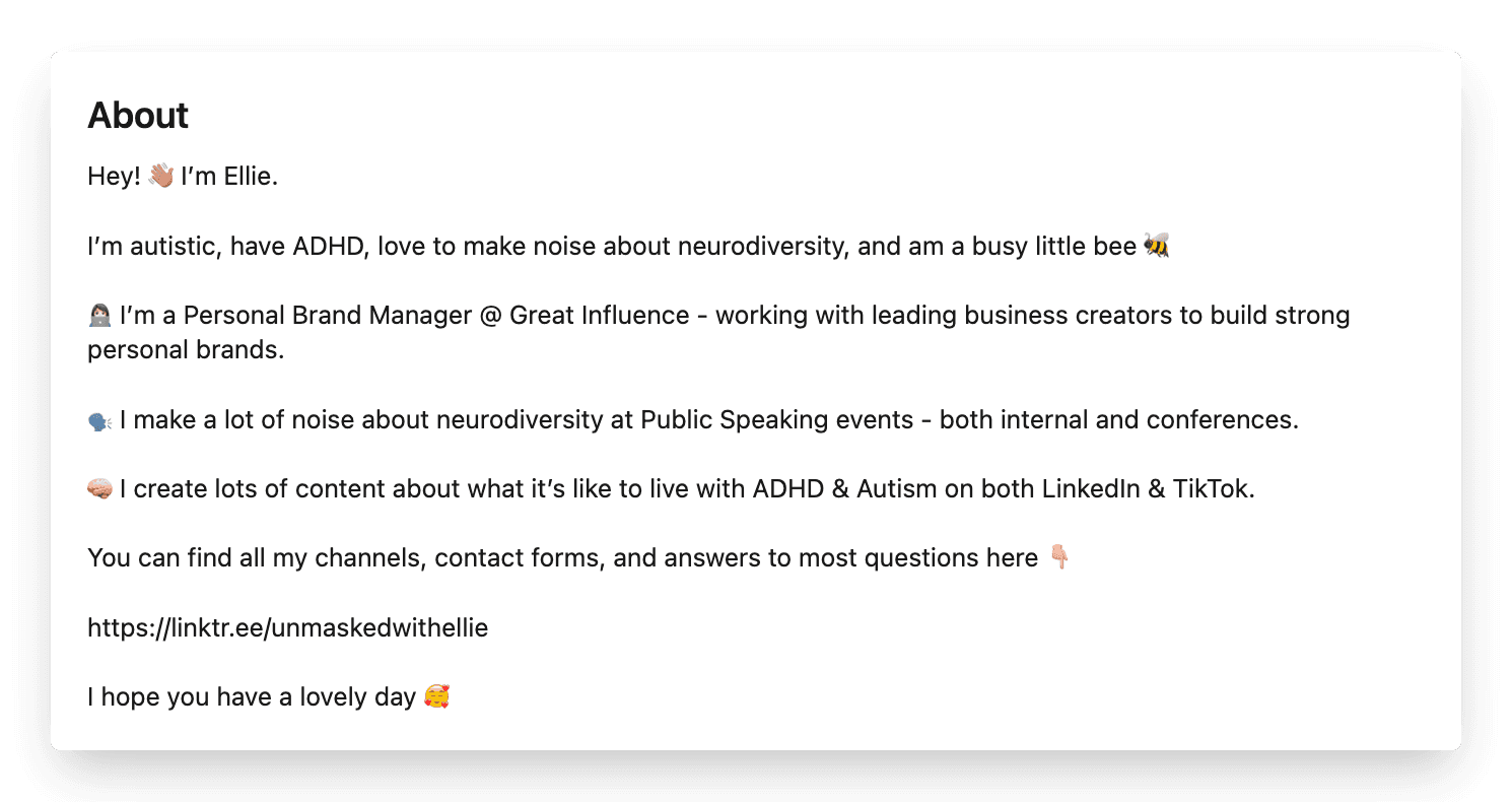 A snippet of the About section of Ellie Middleton, one of the biggest creators on LinkedIn. Click here for the full version.