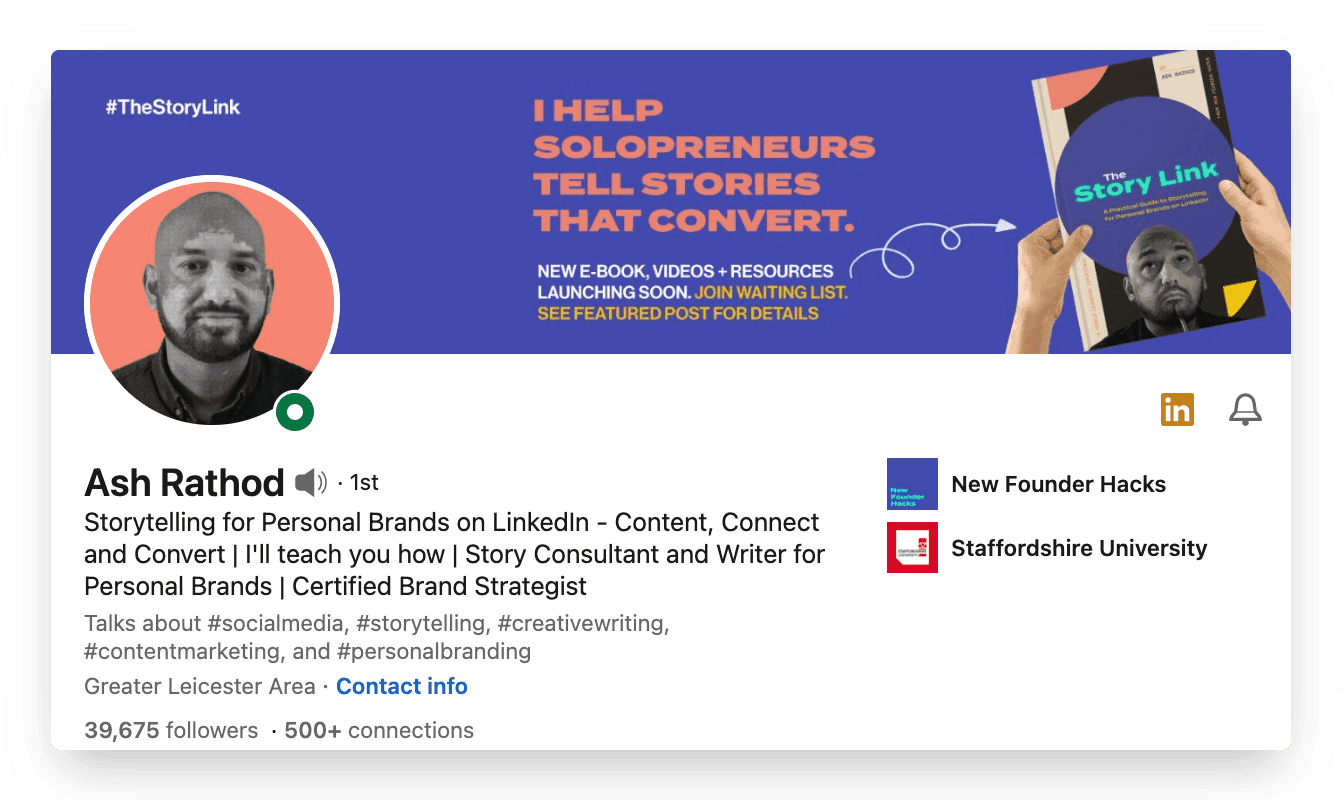 Ash highlights his expertise in his first line "Storytelling for Personal Brands on LinkedIn" and then adds “I’ll teach you how”