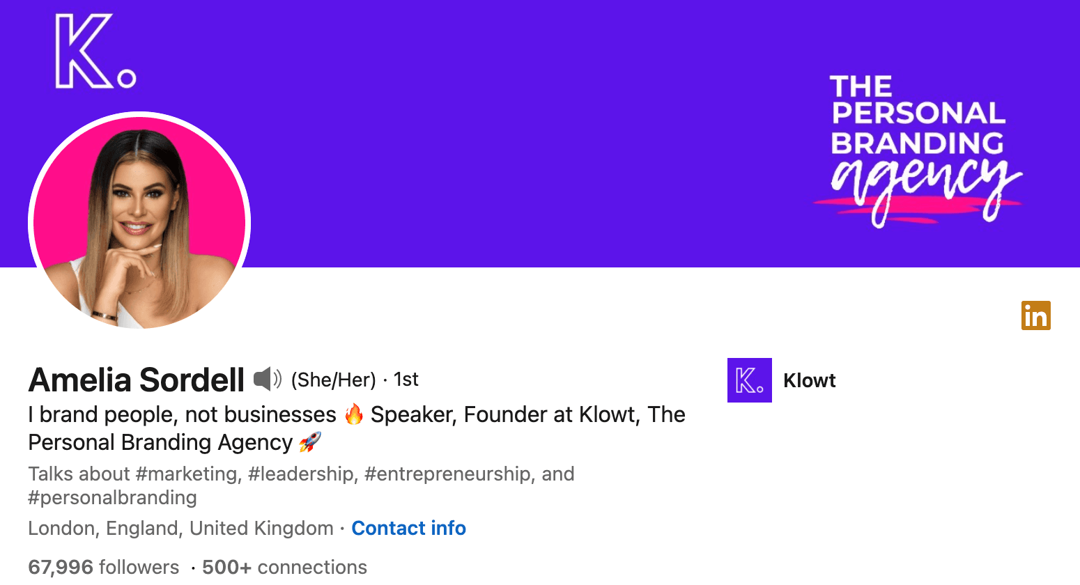 Amelia uses a smart but funny way to showcase her expertise in personal branding. Her bio instantly makes clear which type of audience she solves for (people, not businesses).
