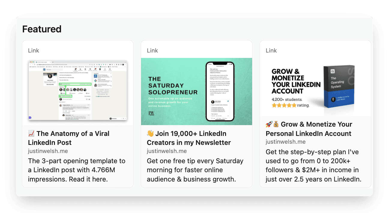 Setting this up strategically, allows you to create a relevant library of content. Here’s an example from Justin's featured section where he posts content from his website.