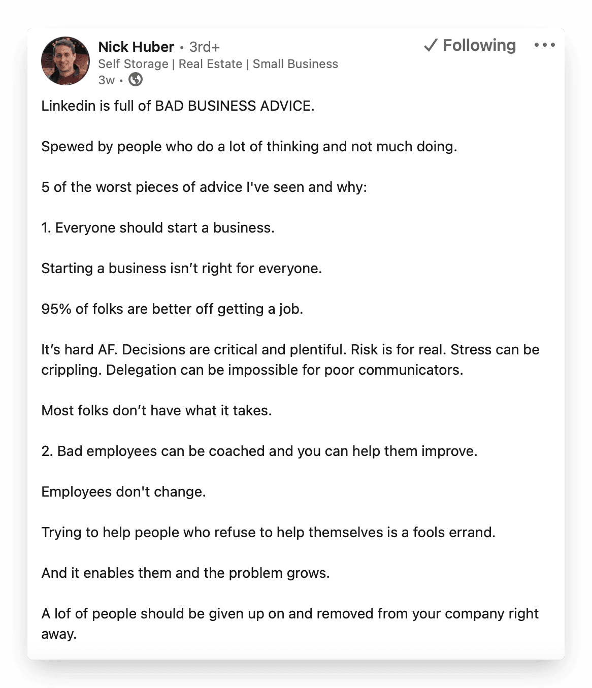 This post by Nick Huber is a great example of something that strays off the beaten path with its ideas as it challenges common pieces of business advice.