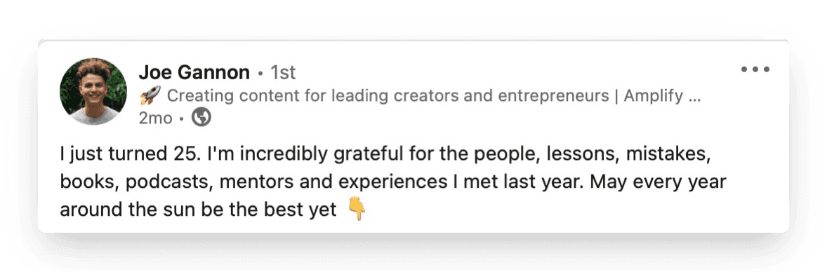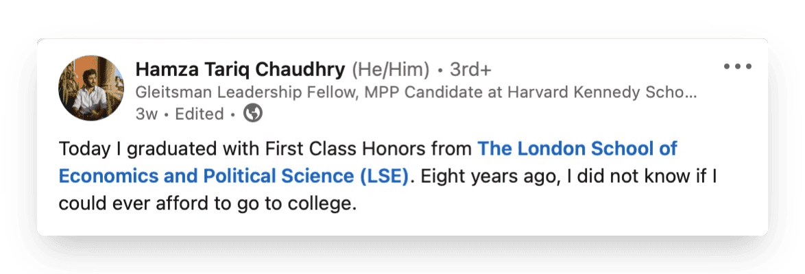 Like with Hamza’s post below, the hook for this post type can be an achievement. A promotion, qualification, or personal announcement.