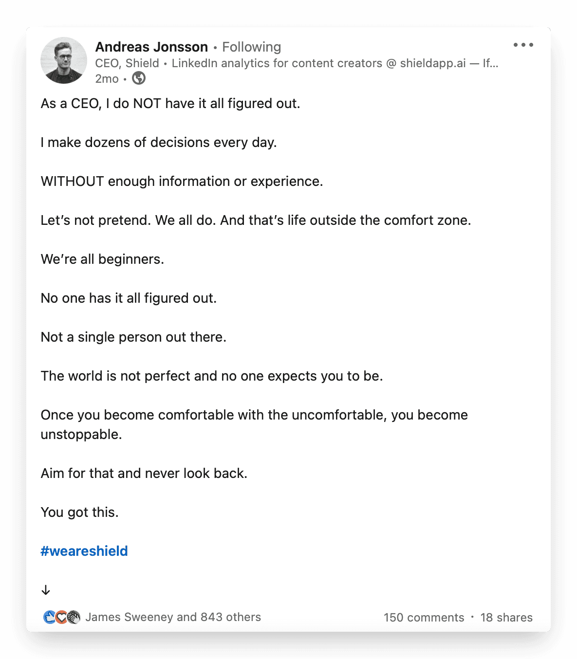 From Admin Assistants to CEOs, everyone has a voice to share their opinions, experiences and vulnerabilities. Take a look at Andreas’s post below for an example of this in practice.