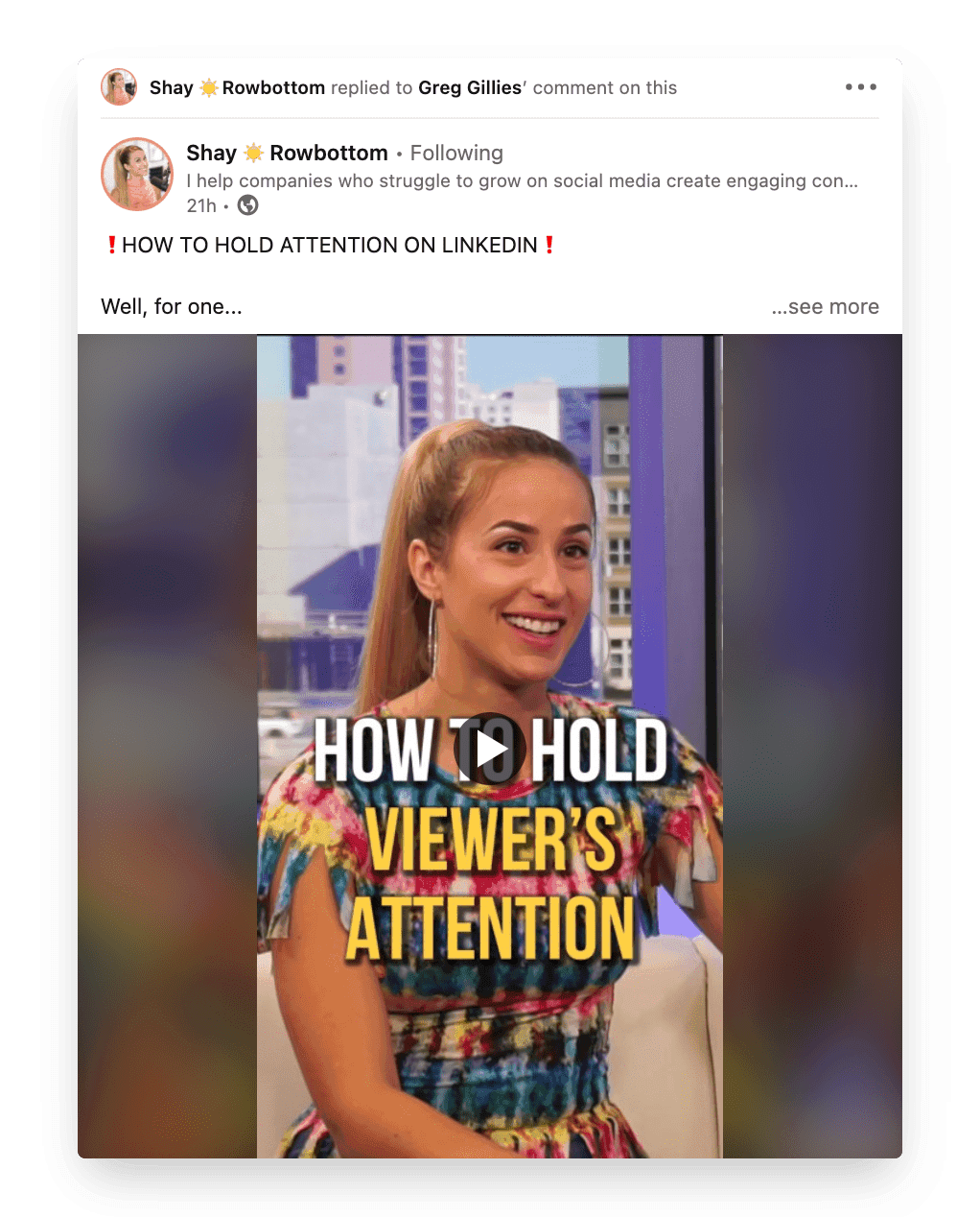 Look at this great example of how to do videos well on LinkedIn natively. Here Shay Rowbottom talks about how to make your LinkedIn video more engaging. Give her a follow for more LinkedIn video tips!