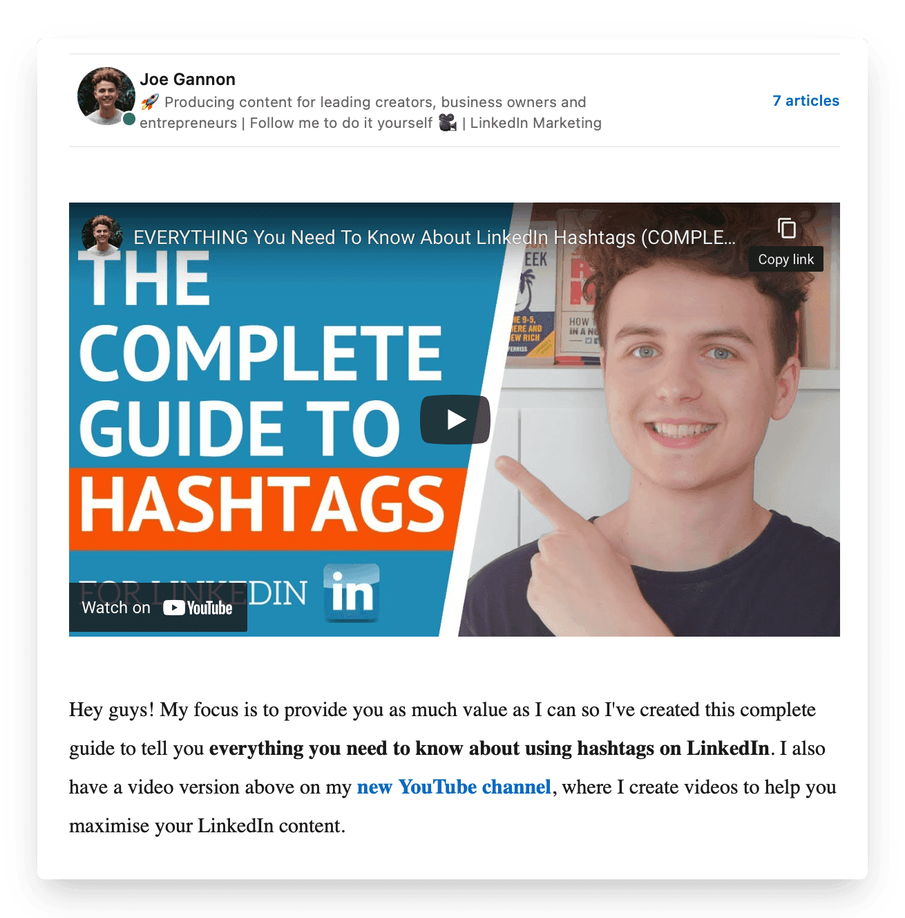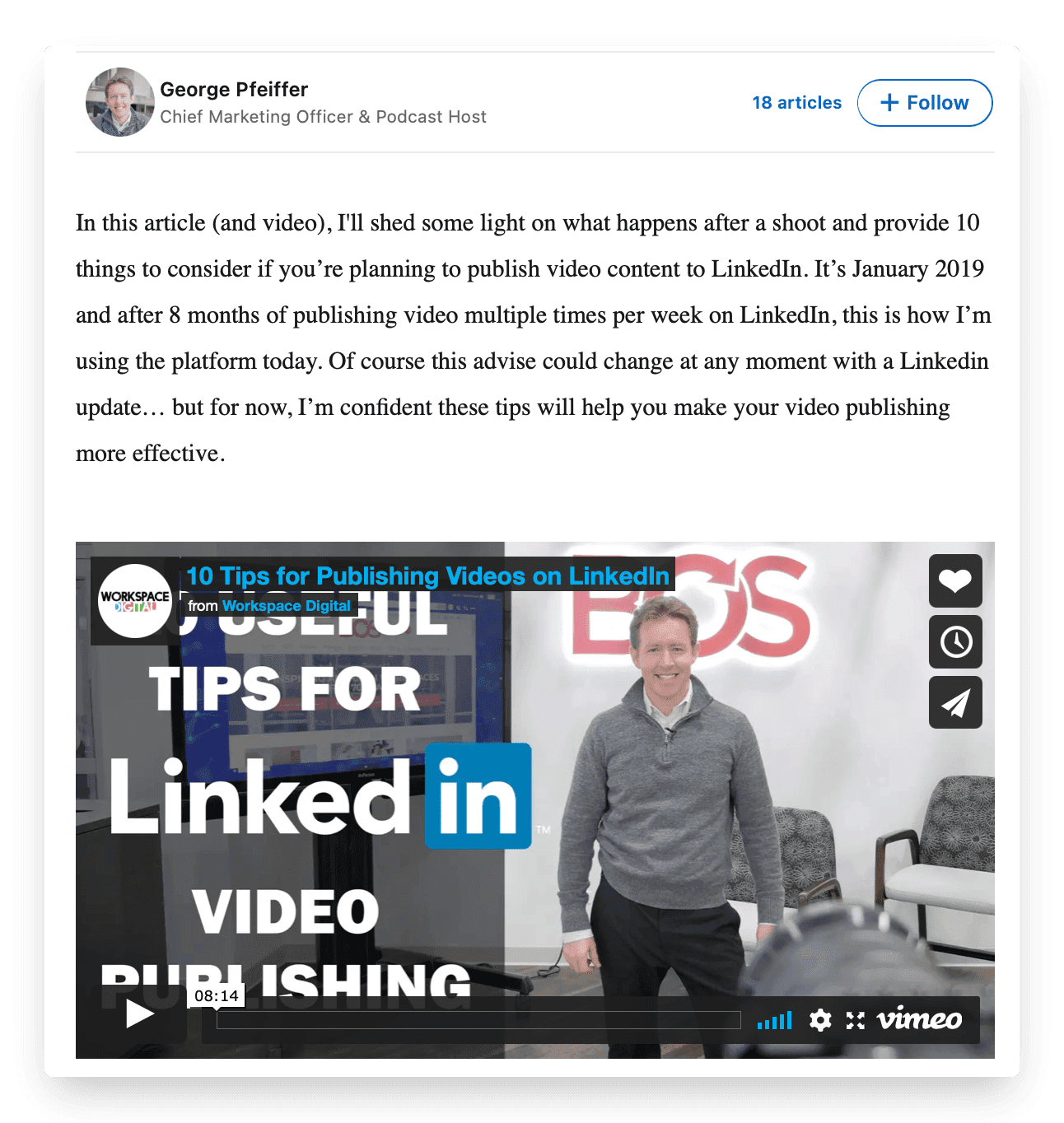 Here's an article by George Pfeiffer. Not only has George written about some great LinkedIn video tips to cement himself as an expert, but he has also supplemented his article with a video. This can help make the content more digestible and provide more context for the article.