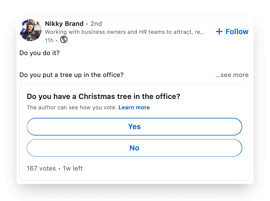 A well-structured poll post has the potential to deliver high engagement and be seen by thousands of people. As a result, polls can act as a catalyst for growing your LinkedIn profile.