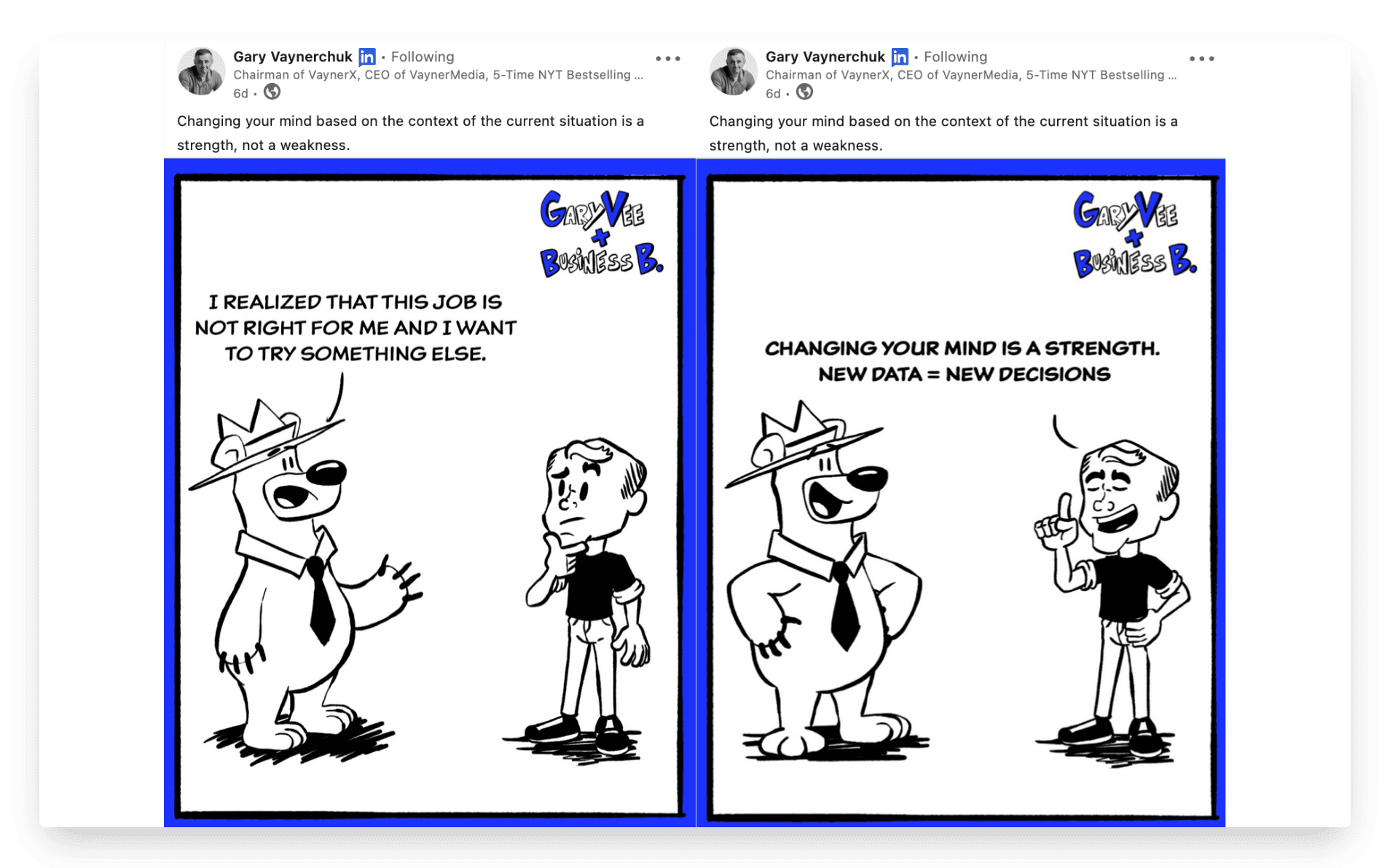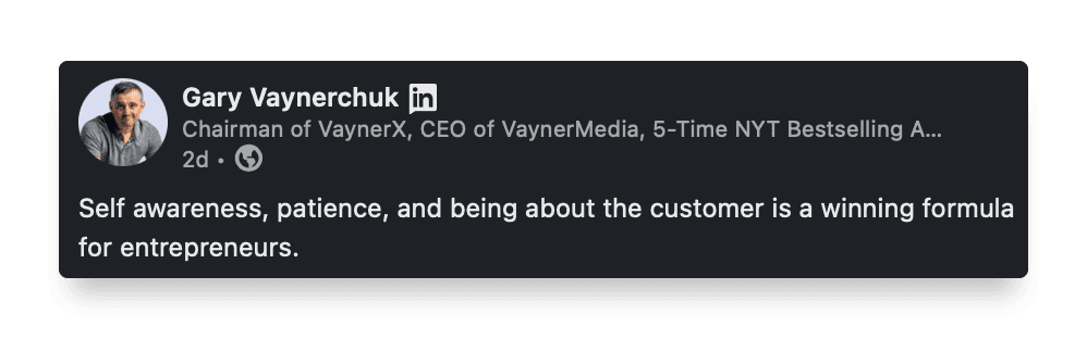 There’s no better example for this simple and elegant LinkedIn post type than the king himself, Gary Vaynerchuk. His posts are all of three below