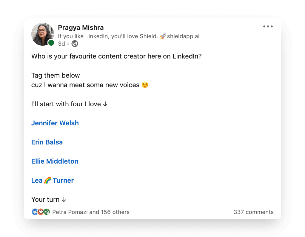 There is an art to asking the right questions. On social media, where we only have one chance to capture someone's attention this becomes even more important. If you are able to ask a question by giving value first, you will see how willingly the LinkedIn community gives back. Look at this simple question from one of Shield's own Pragya. She opens her post with a simple one line question,
