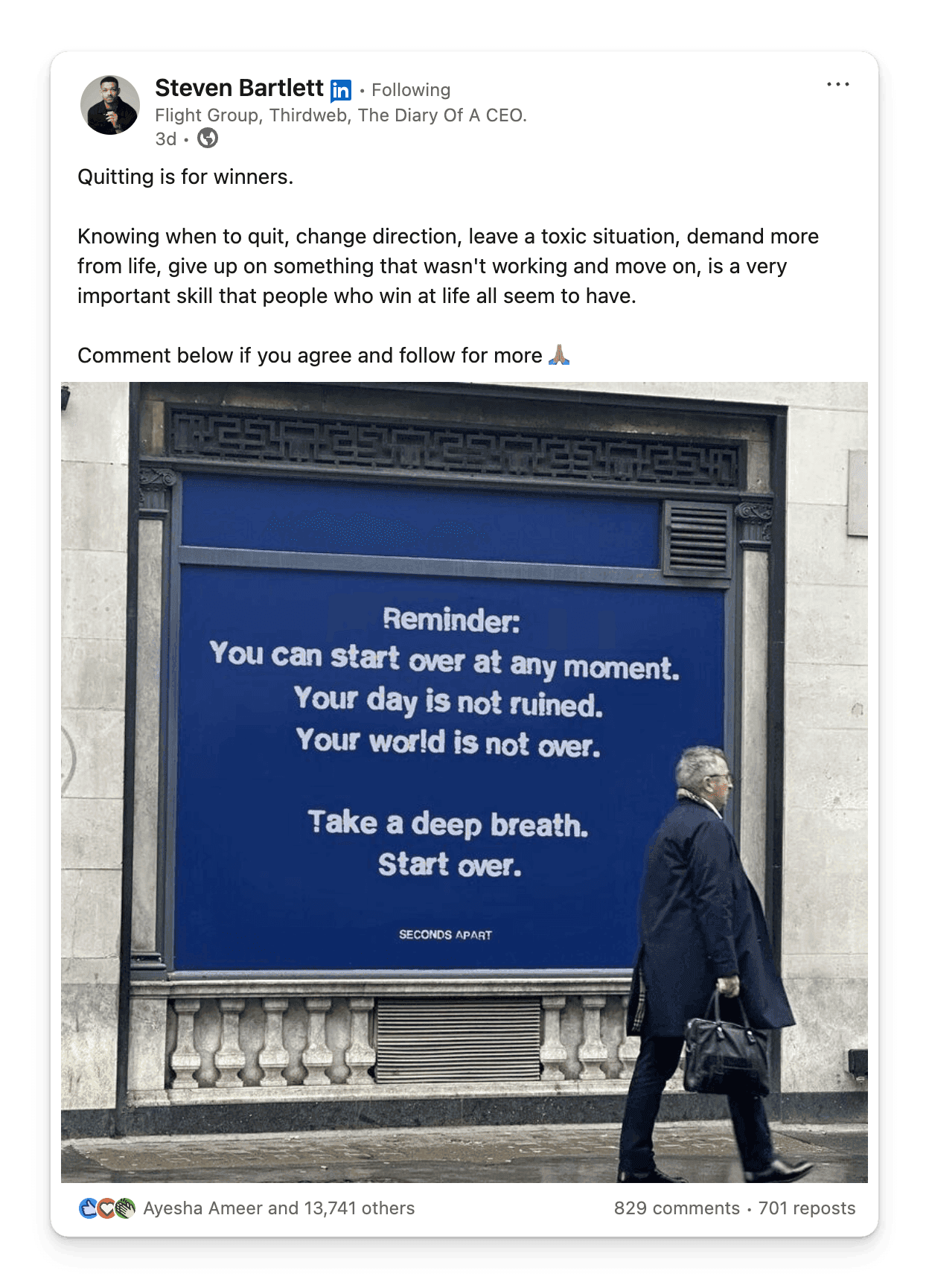 Here’s a post by Steven Bartlett. Steven says something we don’t hear often: It’s okay to quit. With content, even the opinions of the underrepresented can be shared with context for us to understand.