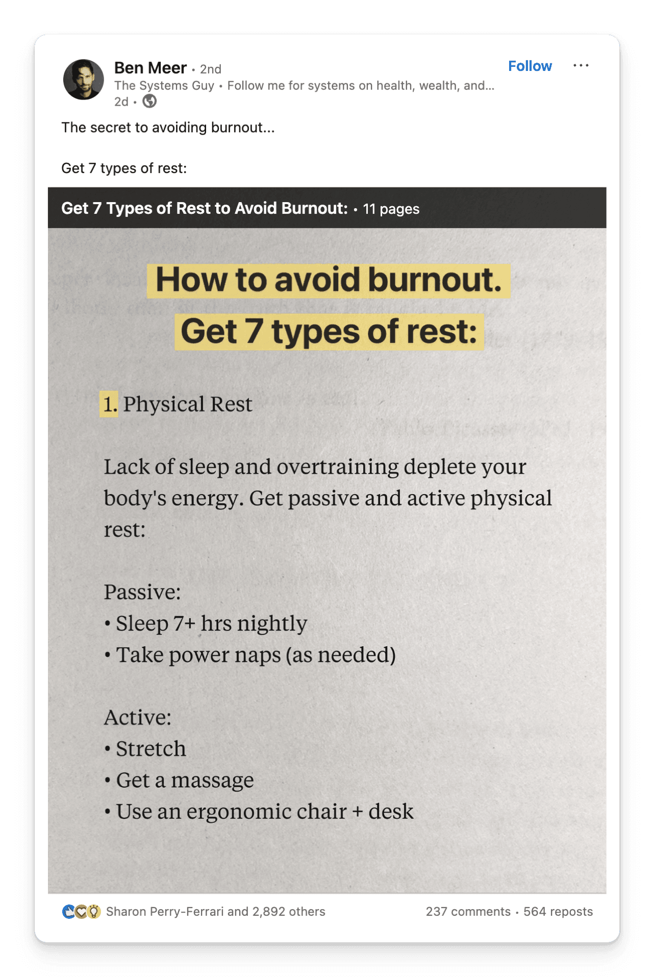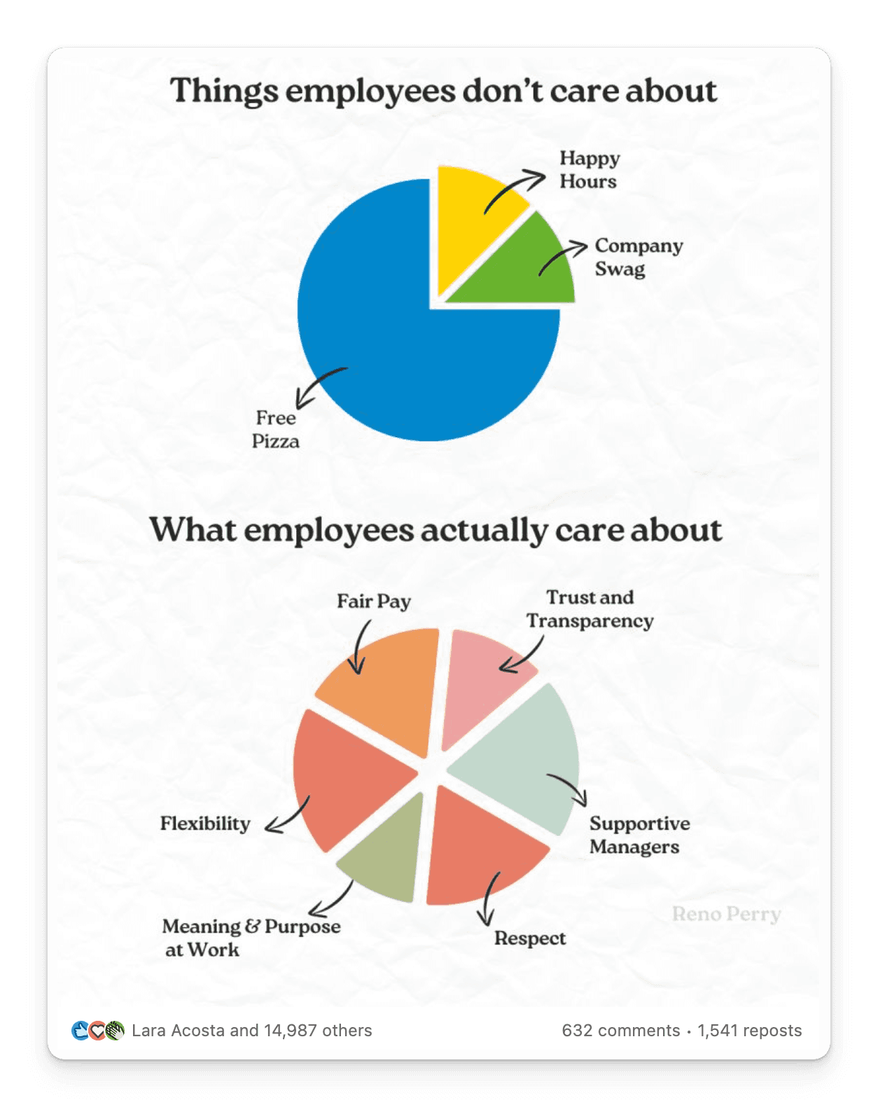 Here’s a post by Reno Perry. Perry talks about what actually matters at work. Let’s be honest, we were probably all thinking the same but not all of us say it out loud. And that’s fine—because all it takes is one good piece of content. 1541 reposts. That’s powerful.
