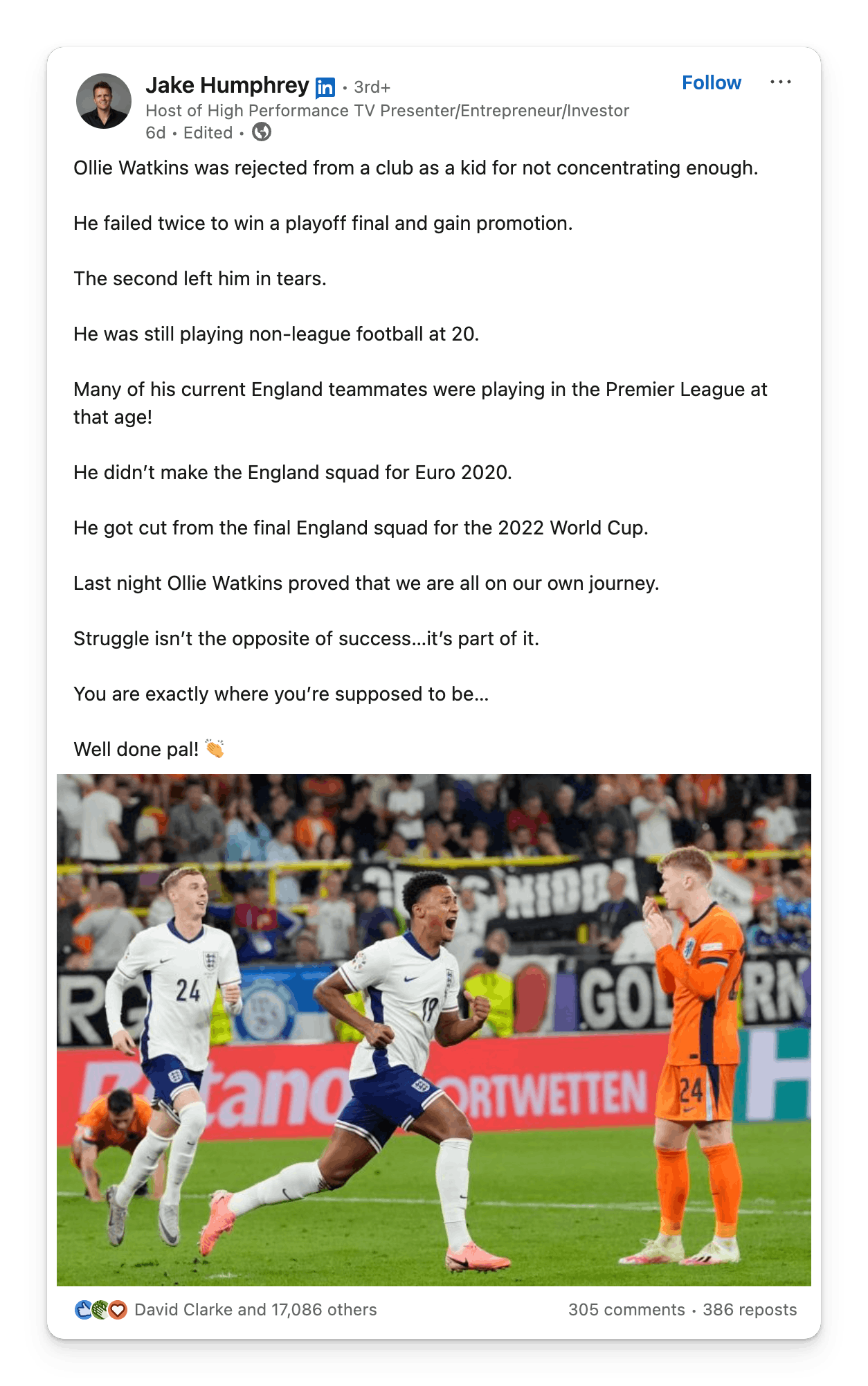 Here’s a post by Jake Humphrey. Jake shares the unheard story of Ollie Watkins. A name we didn’t really know until he scored that 90-minute goal against the Netherlands, getting England to the Euros finals. See, someone’s story is not always meant to be told by the protagonist but by those who observe.